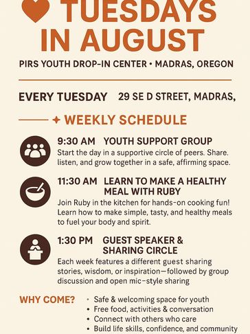 Location: PIRS Youth Drop-In Center, 29 SE D Street, Madras, Oregon